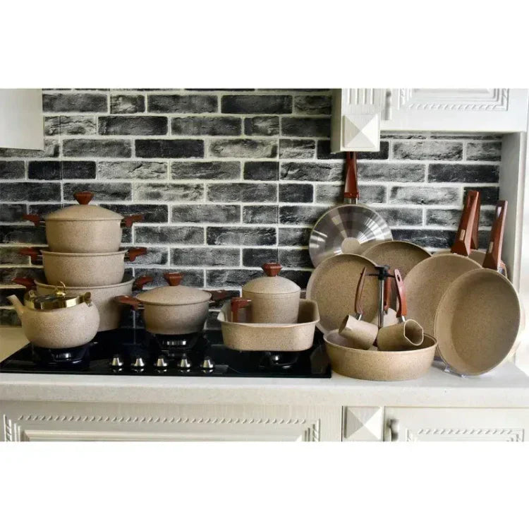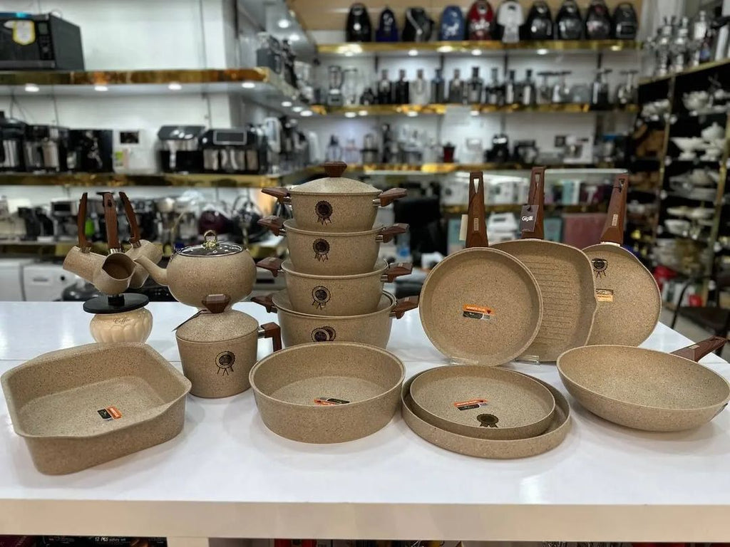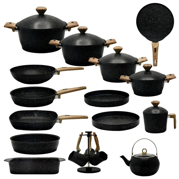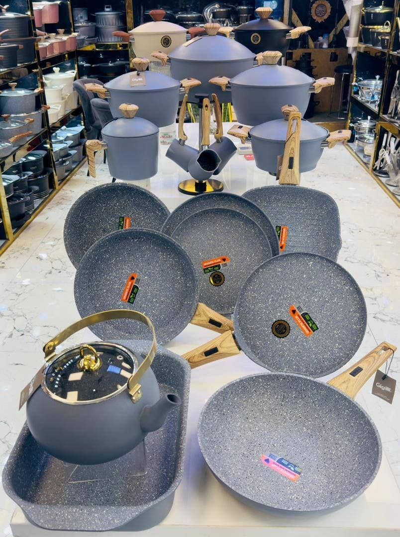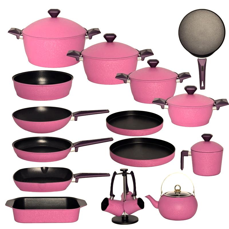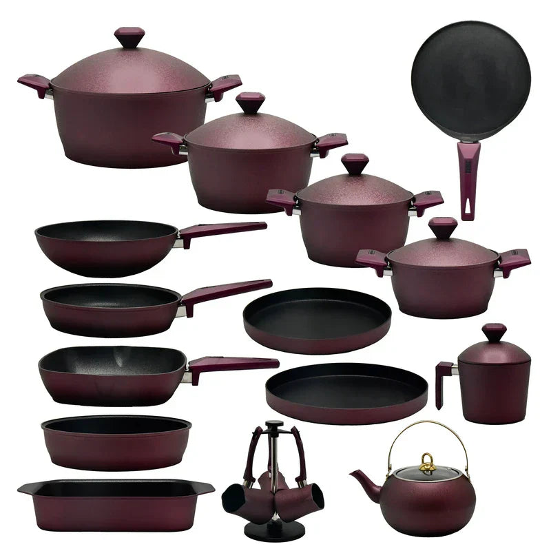 O que vem na caixa: 2 Caçarolas Antiaderentes com tampas —1 Panela Grande Antiaderente com tampa — 1 Panela Média Antiaderente com tampa — 1 Panela Pequena Antiaderente com tampa — 1 Bule — 1 Fervedor Antiaderente — 3 Frigideiras Antiaderentes de tamanhos variados — 2 Chapas para grelha — 1 Conjunto de utensílios premium.